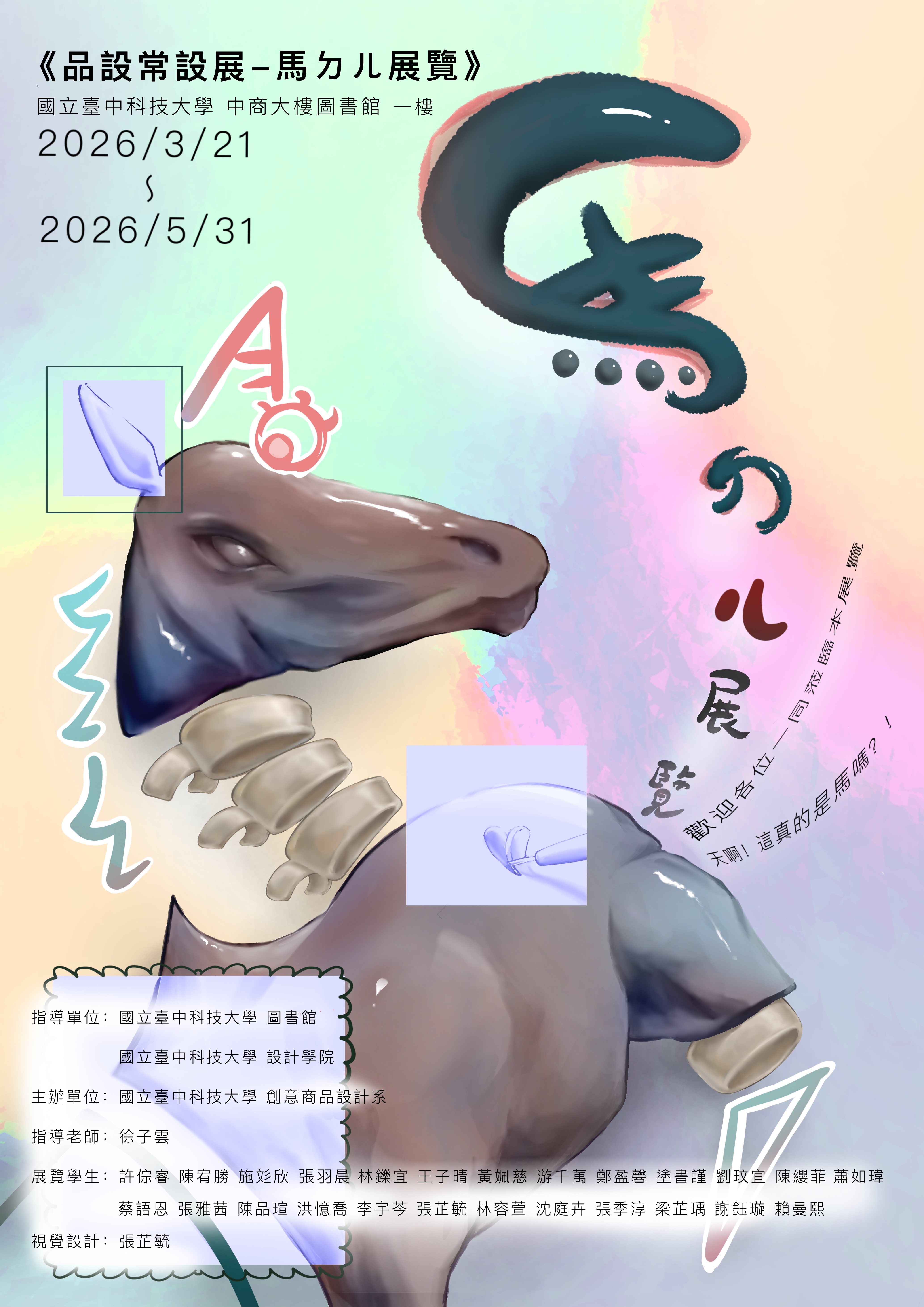 天啊!這真的是馬嗎?!怎麼會長著角、有奇形怪狀的身體?Hi~~各位觀眾,本展覽竭誠歡迎您停下腳步一同感受,品設二甲的同學們,將創意與設計揉進黏土,透過手的溫度,捏出各式各樣奇特古怪的「馬」,融合自我特色與黏土產生意想不到的化學反應,邀請您一起深入探索同學們的想像力吧!